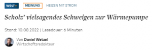 Allein um die etwa 43 Millionen Haushalte in Deutschland – kein Gewerbe, keinen Handel, keine Industrie – mit Wärmepumpen zu beheizen, werden etwa 130 TWh Strom zusätzlich regenerativ erzeugter Strom benötigt. Das ist mehr als ein Viertel des bisherigen Nettobedarfs gesamt. Und selbstverständlich nicht im Durchschnitt, sondern mit Schwerpunkt im kalten Halbjahr Herbst/Winter. Mittels Verstromung durch bereits vorhandene Windkraft- und PV-Anlagen wurden 2021 gut 160 TWh hergestellt. Das zur besseren Einordnung von 130 TWh Strom.