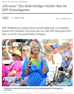 Die Erkenntnis, dass das sogenannte Gendern ziemlich peinlich ist, hat sich offensichtlich nun auch dort verbreitet, wo man besonders eifrig betreibt, nämlich vor den Kameras und Mikrofonen der öffentlich-rechtlichen Sendeanstalten. Die Moderatorin Andrea Kiewel jedenfalls, wohlgemerkt keine politische Journalistin, sondern Moderatorin des „ZDF-Fernsehgarten“ hat an diesem Wochenende mit einer kurzen Zwischenbemerkung für sozialmediale Aufregung gesorgt. …