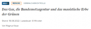 … in der Corona-Krise beruft sich Klaus Müller [Link von MEDIAGNOSE] in der Gaskrise auf Experten, um seine moralischen Belehrungen zu legitimieren. Seine Bundesnetzagentur scheint eher auf Demontage als auf den Energie-Ausbau aus zu sein. Das liegt auch am ideologischen Erbe der Grünen. …