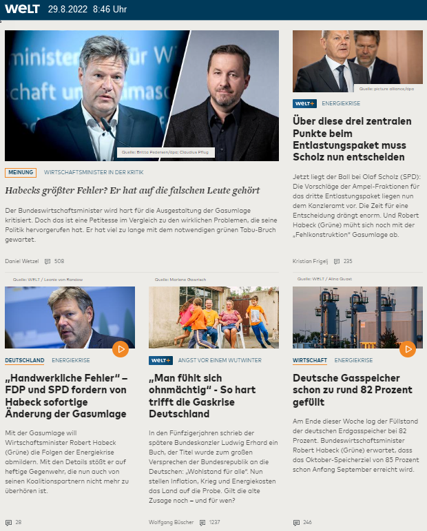 Das ergibt sich aus den Leserkommentaren zu den Artikeln in diesem WELT-Block. Deshalb sind neben der PDF* auch immer Auszüge aus den Kommentaren beigefügt. Wir danken der WELT ausdrücklich für die hervorragende Berichterstattung. Insbesondere Daniel Wetzel, aber auch etliche andere Redakteure (gM) der WELT begleiten das Thema „Energie (-Krise)“ seit langem kompetent und engagiert.