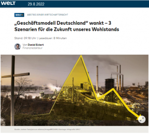 Es ist trefflich über den Abstieg Deutschlands zu spekulieren. Wie damals in den frühen 2000-er Jahren. Bis Gerhard Schröder im März 2003 die Agenda 2010 vorstellte. Auf die Idee, dass die Öffnung von Nordstream II, der unbefristete Weiterbetrieb der 2021 abgeschalteten AKW plus dem Nichtabschalten der noch laufenden AKW, dass die ebenfalls unbefristete Reaktivierung von Kohlekraftwerken plus Nichtabschaltung von noch am Netz befindlichen Kohlekraftwerken den Niedergang Deutschlands verhindern könnten, auf diese Idee kommen Politik und Medien nicht.