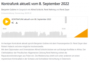 Im heutigen Kontrafunk aktuell spricht Benjamin Gollme mit dem Finanzexperten Dr. René Zeyer über Robert Habeck und eine mögliche Insolvenzwelle. Mit dem Diplomaten und Orientalisten Dr. Alfred Schlicht blicken wir auf blutige Konflikte in Afrika. Der Chefredakteur der Preußischen Allgemeinen Zeitung René Nehring ordnet die Reparationsforderungen aus Polen ein. Die Medienschau dreht sich unter anderem um einen mysteriösen Kriminalfall in der Schweiz und Schnelltest-Vernichtung in Österreich.