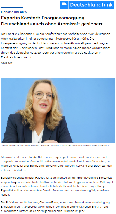 Knappe Energieträger vor allem Erdgas führen zu massivem Preisanstieg der Wärme- und Stromversorgung, der Energieversorgung von Handel, Gewerbe und Industrie. Ende dieses Jahres sollen die letzten drei Kernkraftwerke Deutschlands faktisch abgeschaltet werden, was zu einer weiteren Verknappung von Energie und so zu einem weiteren Preisanstieg führen wird. Zudem wird der CO2-Ausstoß weiter ansteigen. Beachten Sie die aktuellen Aussagen unten von Frau Kemfert, die als so wichtig erachtet werden, dass sie in den Dlf-Nachrichten zusammengefasst werden.