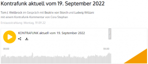 … mit der AfD-Bundestagsabgeordneten Beatrix von Storch über den Ausgang der Wahl in Schweden, die Wirtschaftspolitik der Ampel-Koalition und ihr spezielles Verhältnis zum deutschen Bundesgesundheitsminister Karl Lauterbach. Über die Situation in Australien nach der rigiden Corona-Politik spricht Wellbrock mit Ludwig Witzani. Im Kommentar macht sich Cora Stephan Gedanken über Großbritannien nach dem Tod der Queen. Die Medienschau mit Oliver Holzer widmet sich den sogenannten Freiheitsenergien und Zapfhähnen, die wegen der Energiesanktionen bald kein Bier geben könnten.