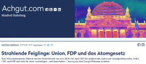 Kernkraft in Deutschland – Sein oder Nichtsein. Bisher waren die meisten Politiker, mit Ausnahme der AfD, der irrigen Überzeugung, dass ein Industriestaat vollständig von Wind- und Sonnenenergie versorgt werden kann. Die Realität, dass nur das Backup der Kernkraft und der Kohle- und Gaskraftwerke diese Illusion aufrechterhalten hat, wurde schlicht verdrängt. Nun hat die Realität die Tür eingetreten und steht mitten im Raum. Es dauert nicht mehr lange, bis der Ruf nach Ermittlung der Schuldigen an der sich anbahnenden Energiekatastrophe unüberhörbar ertönen wird. Panik breitet sich im hohen Hause aus. …