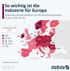 … trägt zu etwas mehr als einem Viertel zum hiesigen Bruttoinlandsprodukt bei. Damit gehört die Bundesrepublik zu den Ländern, deren Industriesektor einen vergleichsweise großen Anteil an der Wirtschaftsleistung hat. Das veranschaulicht die Infografik auf Basis von Daten der World Bank. Neben Irland und Norwegen befinden sich viele osteuropäische Länder im Spitzenfeld. …