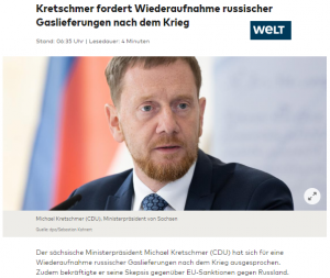 Deutschland & Russland & Wirtschaft aktuell: Michael Kretschmer (CDU) – Ein Mann mit Realitätssinn Quelle Artikel ________ Zweite, intakte Röhre Nordstream II sofort öffnen. Alle sechs Kernkraftwerke dauerhaft weiterbetreiben/reaktivieren. Alle Sanktionen gegen Russland sofort beenden. Keine Hilfen mehr für die Ukraine.
