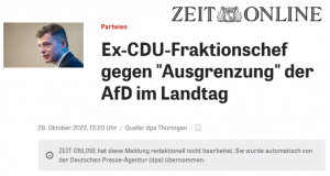 Die direkte Zugabe der Ausgrenzung von gewählten Abgeordneten der AfD durch einen Landes-Spitzenpolitiker der CDU ist bemerkenswert. Die Menschen in den Parteien, diese Parteien glauben, sie seien demokratisch.