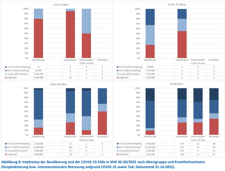 Der offizielle Tagesreport der DIVI wirft zum 2.10.2022 996 Personen aus, die wegen Corona auf der Intensivstation liegen. Tatsächlich wegen COVID-19 sind in den untersuchten vier Wochen lt. RKI-Monitoring 101 Menschen auf der Intensivstation wegen einer tatsächlichen COVID19 -Erkrankung behandelt worden. Die allermeisten Menschen, die die DIVI aufführt, haben nur einen positiven Corona-Test (996 ./. 101 = 895 Menschen) neben einer anderen Haupterkrankung.
