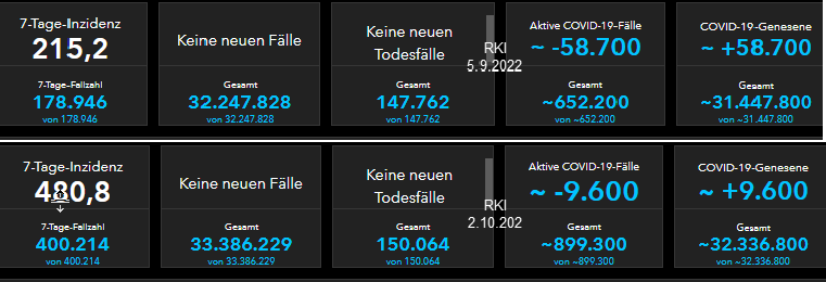 199 Menschen sind gemäß RKI Monitoring tatsächlich in der Zeit vom 5.9.2022 bis 2.10.2022 an COVID 19 verstorben. Die Differenz zu den RKI-Tagesberichten ergibt 2.303 Corona-Tote. 2.303 ./. 199 =2.104 Personen sind an irgendwas verstorben. Nur nicht direkt an Corona. Sie hatten lediglich einen positiven CORONA-Test.