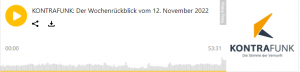 Kontrafunk aktuell Wochenrückblick 12.11.2022 & Kontrafunk Nachrichten vom 12.11.2022 – 6:00 Uhr Kontrafunk Nachrichten vom 12.11.2022 – 6:00 Uhr https://www.mediagnose.de/wp-content/uploads/2022/11/Kf_Nachrichten_12112022_6_-Uhr_.mp3 Quelle ________ Der Wochenrückblick vom 12. November 2022 Erstausstrahlung: Samstag, 12.11.22, 06:05 Uhr Kontrafunk aktuell Wochenrückblick 12.11.2022 hören