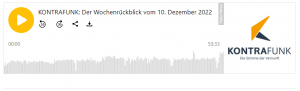 Kontrafunk aktuell Wochenbericht 10.12.2022 & Kontrafunk Nachrichten vom 10.12.2022 – 6:00 Uhr Kontrafunk Nachrichten vom 10.12.2022 – 6:00 Uhr https://www.mediagnose.de/wp-content/uploads/2022/12/Kf_Nachrichten_10122022.mp3 Quelle Der Wochenrückblick vom 10. Dezember 2022 mit Robert Lehmann Erstausstrahlung: Samstag, 10.12.22, 06:05 Uhr Wochenrückblick vom 10.12.2022 hören