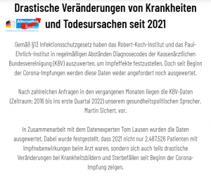 Seit Beginn der Corona-Impfung zeigen sich in der Bevölkerung teils drastische Veränderungen bei Krankheitsbildern und Sterbefällen. Das geht aus Daten der Kassenärztlichen Vereinigung hervor, die Martin Sichert zusammen mit dem Datenexperten Tom Lausen exklusiv auswerten konnte und die auf der Pressekonferenz präsentiert werden. Patientendaten der Kassenärztlichen Bundesvereinigung (KBV) zu Nebenwirkungen der Corona-Impfungen liefern erschreckende Erkenntnisse: Mit Beginn der Corona-Massenimpfungen stieg die Zahl derjenigen, die „plötzlich und unerwartet“ gestorben sind, sprunghaft im Vergleich zu den Vorjahren auf das mehr als Vierfache an. In jedem Quartal, beginnend mit dem ersten Quartal 2021, wurden von Kassenärzten mehr plötzliche und unerwartete Todesfälle festgestellt, als in jedem Gesamtjahr von 2016 bis 2020.