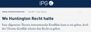 Insofern ist Vorsicht geboten, wenn ein Autor wie Huntington eine einzige Ursache für Konflikte, nämlich einen Zusammenprall von Kulturen, als vorherrschend postuliert. Auch besteht über die Definition von Begriffen wie Kultur und Zivilisation keine Einigkeit. Auf diesem wackligen Fundament ganze geografische Räume abgrenzen zu wollen, die von bestimmten Kulturen geprägt seien, ist ein nicht konsequent durchzuhaltendes Unterfangen. Erst recht, wenn Huntington behauptet, diese „Großkulturen“ stünden – tektonischen Platten gleich – in Gefahr, Bruchlinien künftiger Konflikte zu bilden.