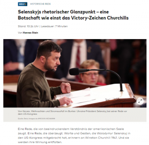 … Wie alle Genannten hat Selenskyj keine Zeit für Artigkeiten, es geht bei ihm immer und sofort ums Eigentliche. Bevor er jetzt nach Washington flog — eine streng geheime Operation, bei der die amerikanische Luftwaffe eine wichtige Rolle spielte —, war er in Bachmut im Donbass gewesen und hatte dort todesmutig die kämpfende Truppe besucht. Die Hand, die in Amerika Joe Biden begrüßte, hatte gerade eben Soldaten die Hände gedrückt, die unter russischem Beschuss stehen.