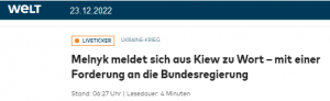 Eine solche Allianz hatte Melnyk bereits im Oktober gegenüber WELT AM SONNTAG gefordert. Damals schlug er vor, dass sich die europäischen Staaten mit vorhandenen Beständen an Leopard-2-Panzern zusammenschließen und zehn Prozent der insgesamt 2000 Exemplare in die Ukraine liefern. „Die Argumente, warum die Panzer nicht an die Ukraine geliefert werden, sind aus unserer Sicht gar nicht überzeugend“, sagte Melnyk nun.