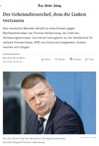 Nicht alle sind so begeistert vom deutschen Geheimdienstchef wie die Leiterin des Berliner Büros von Amerikas führender linksliberaler Zeitung [New York Times]. Nachdem sich Haldenwang bei der Podiumsveranstaltung im Hambacher Schloss in bemerkenswert freundlichen Worten über die linksradikalen Klimaschützer der Letzten Generation geäussert hatte, reagierten vor allem die Innenpolitiker von CDU und CSU verärgert.
