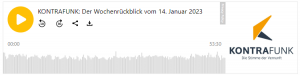 Kontrafunk aktuell Wochenrückblick 14.1.2023 & Kontrafunk Nachrichten vom 14.1.2023 Kontrafunk Nachrichten vom 14.1.2023 https://www.mediagnose.de/wp-content/uploads/2023/01/Kf_Nachrichten_14012023.mp3 Quelle Der Wochenrückblick vom 14. Januar 2023 mit Gernot Danowski Erstausstrahlung: Samstag, 14.01.23, 06:05 Uhr Quelle & Kontrafunk Wochenrückblick 14.1.2023 hören