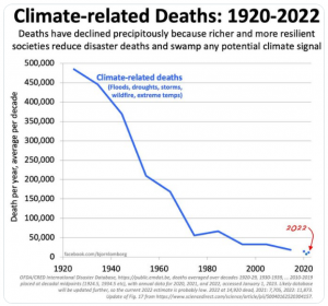 Eine Grafik des dänischen Wissenschaftlers Björn Lomborg zeigt die Abnahme der Todesopfer bei Extremwetter. Sie demonstriert spektakulären Fortschritt: Um mehr als 90 Prozent sind die Opferzahlen zurückgegangen, obwohl die Weltbevölkerung sich in der gleichen Zeit vervierfacht hat.