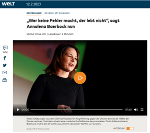 Baerbock hatte Ende Januar mit folgenden Worten zum Zusammenhalt der westlichen Verbündeten aufgerufen: „Wir kämpfen einen Krieg gegen Russland und nicht gegeneinander.“ Diese Äußerung beim Europarat in Straßburg hatte für großes Aufsehen und Kritik gesorgt. Das Auswärtige Amt stellte daraufhin klar, dass Baerbock damit keine Kriegsbeteiligung Deutschlands oder seiner Verbündeten gemeint habe.