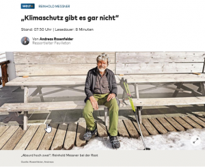 … sagt Messner, der von 1999 bis 2004 für die italienischen Grünen im Europaparlament saß. Ihn stört am Klimaprotest das Katastrophische. So sei es zur Zeit des „Ötzi“ vor 5300 Jahren wärmer gewesen als heute. Hätte es am Fundort damals Gletscher gegeben, wäre die Leiche ins Tal getragen und „zerbröselt“ worden. „Klima ist Wandel“, sagt Messner, „Klimaschutz gibt es gar nicht.“ Natürlich müsse man über die globale Erwärmung reden, aber die Idee einer Rache der Natur am Menschen helfe nicht. Sie stört ihn an der „Letzten Generation“ so, wie sie ihn schon an der „heroischen“ Bergsteigergeneration der Weltkriege störte, die rhetorische Kriege gegen die Gipfel führte: