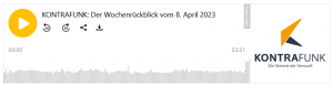 Kontrafunk aktuell Wochenrückblick 8.4.2023 & Kontrafunk Nachrichten vom 8.4.2023 – 6:00 Uhr Kontrafunk Nachrichten vom 8.4.2023 – 6:00 Uhr https://www.mediagnose.de/wp-content/uploads/2023/04/Kf_Nachrichten_08042023.mp3 Quelle Wochenrückblick vom 8. April 2023 mit Robert Meier Erstausstrahlung: Samstag, 8. April 2023, 5:05 Uhr Quelle & Kontrafunk Wochenrückblich 8.4.2023 hören