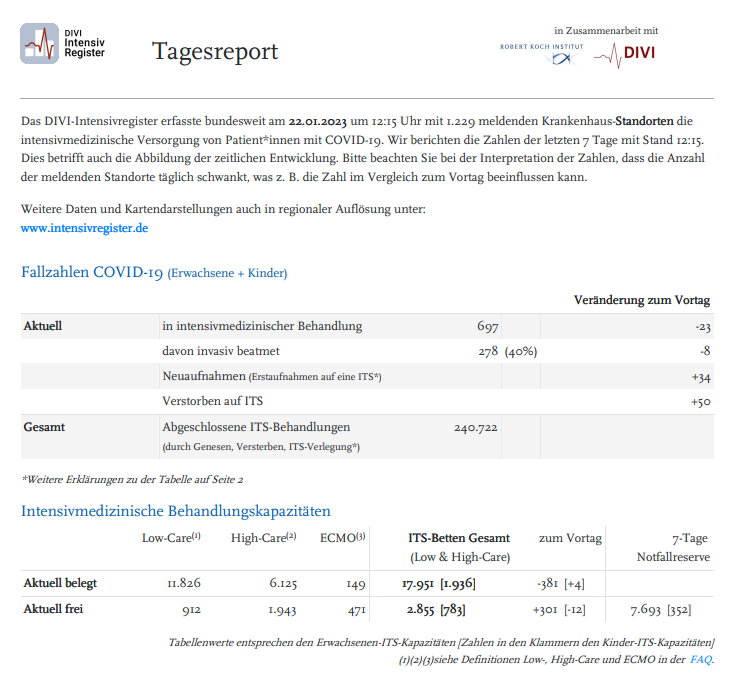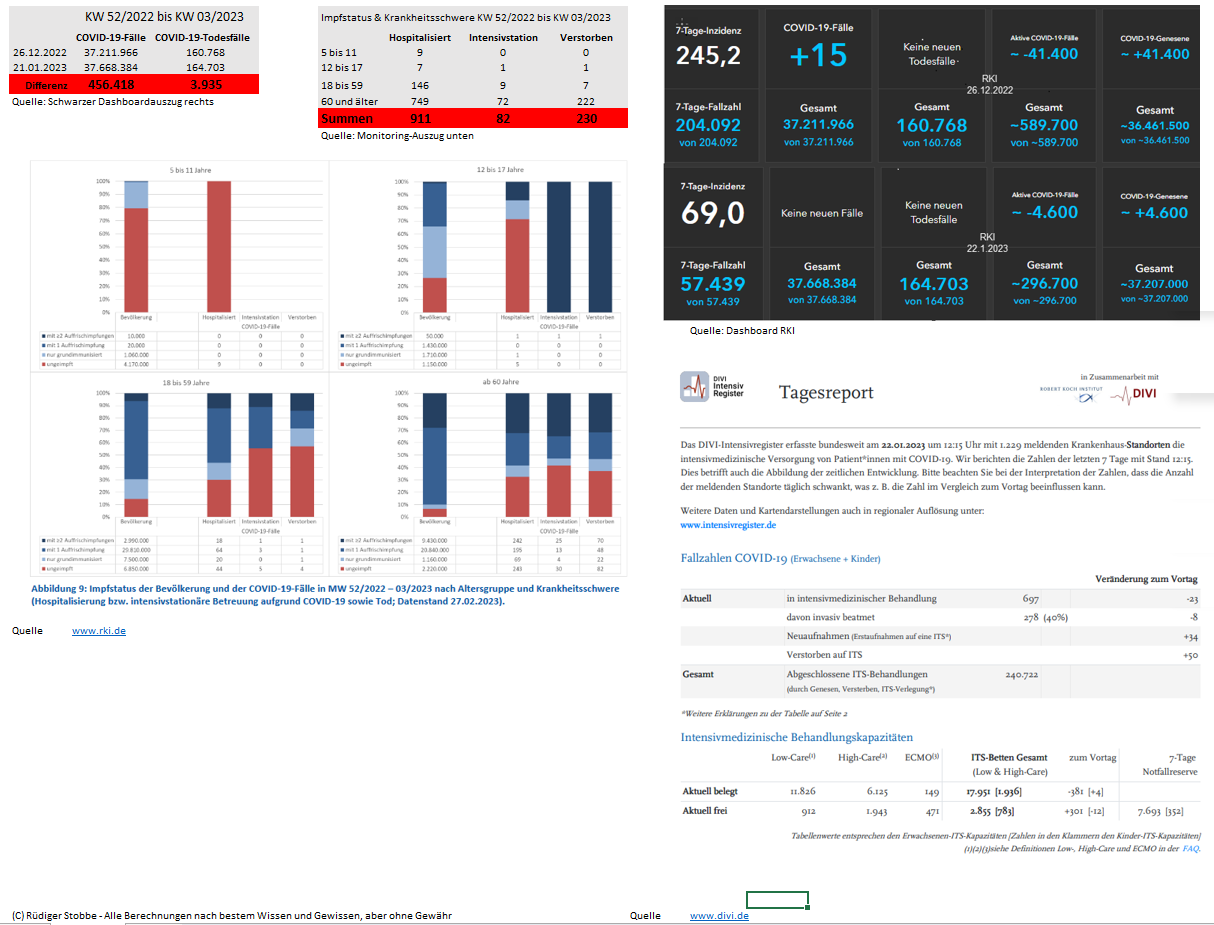 Der offizielle Tagesreport der DIVI wirft zum 22.1.2023 697 Personen aus, die wegen Corona auf der Intensivstation liegen. Tatsächlich wegen COVID-19 sind in den untersuchten vier Wochen lt. RKI-Monitoring 82 Menschen auf der Intensivstation wegen einer tatsächlichen COVID 19 -Erkrankung behandelt worden. Die allermeisten Menschen, die die DIVI aufführt, haben nur einen positiven Corona-Test (697 ./. 82 = 615 Menschen) neben einer anderen Haupterkrankung.