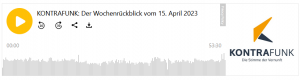 Kontrafunk aktuell 15.4.2023 Wochenrückblick & Kontrafunk Nachrichten vom 15.4.2023 – 6:00 Uhr Kontrafunk Nachrichten vom 15.4.2023 – 6:00 Uhr https://www.mediagnose.de/wp-content/uploads/2023/04/Kf_Nachrichten_15042023.mp3 Quelle & aktuelle Nachrichtenausgabe Wissenschaftler fordern Weiterbetrieb der Kernkraftwerke _________ Wochenrückblick vom 15. April 2023 mit Robert Meier Erstausstrahlung: Samstag, 15. April 2023, 5:05 Uhr Kontrafunk aktuell 15.4.2023 Wochenrückblick hören
