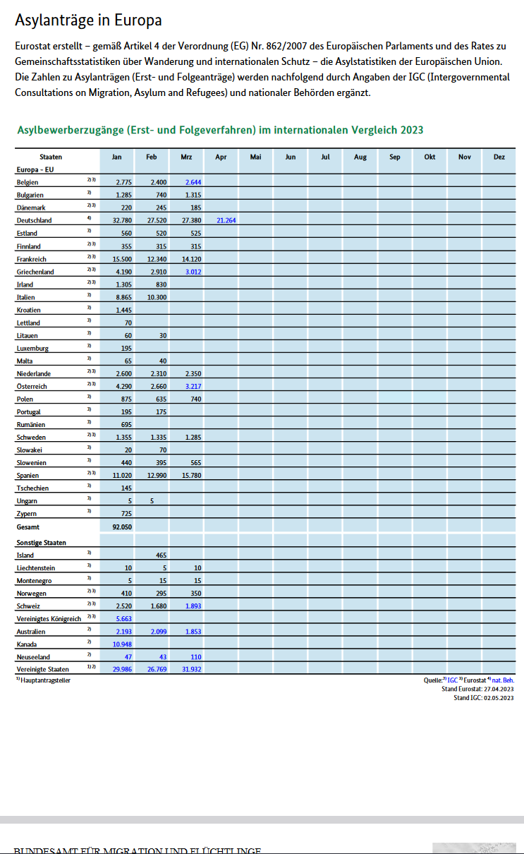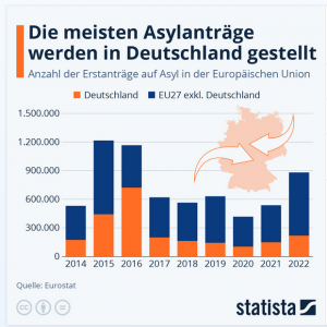 Die Gesamtzahl der in der EU gestellten Asyl-Erstanträge ist 2022 gegenüber dem Vorjahr deutlich gestiegen, von 389.180 auf 663.485 – das entspricht einem Anstieg von rund 64 Prozent. Davon entfielen 217.735 Anträge auf Deutschland (entspricht einem Anteil von rund 25 Prozent), gefolgt von Frankreich (137.510 Anträge) und Spanien (116.135 Anträge).