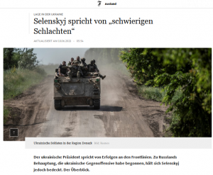 Unter dem Eindruck von Berichten über die möglicherweise gestartete ukrainische Gegenoffensive hat Präsident Wolodymyr Selenskyj von „besonders schwierigen Schlachten“ gesprochen. Er habe am Freitag ein Treffen mit der Stawka, dem Oberkommando der Ukraine, abgehalten, sagte Selenskyj in seiner abendlichen Videoansprache. Es sei um „unsere Defensivhandlungen, unsere Offensivhandlungen, unsere Gewinne an den Frontlinien“ gegangen. Dann dankte Selenskyj allen Soldaten, „die sich in diesen Tagen in besonders schwierigen Schlachten befinden“ […]