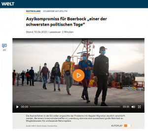 Die mit Unterstützung der Bundesregierung vereinbarten Pläne für eine weitreichende Reform des EU-Asylsystems sehen zahlreiche Ergänzungen und Verschärfungen vor, um illegale Migration zu begrenzen. Geplant ist insbesondere ein deutlich härterer Umgang mit Menschen aus Ländern, die als relativ sicher gelten. Sie sollen künftig nach einem Grenzübertritt in streng kontrollierten Aufnahmeeinrichtungen untergebracht werden. In den Reihen von Baerbocks grüner Partei hatte der Asylkompromiss für scharfe Kritik gesorgt.