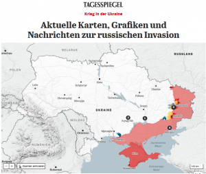 Mit der interaktiven Karte gleich zu Beginn der Seite können die Bewegungen und politgeografischen Veränderungen in der Ukraine seit Beginn des Krieges am 24.2.2022 chronologisch nachgezeichnet werden. Wichtige Ereignisse werden auf der Karte markiert und kurz kommentiert.