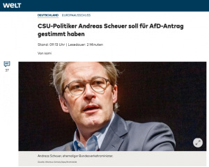 … Abgeordnete der Unionsfraktion haben Medienberichten zufolge erstmals gemeinsam mit der AfD in einem Bundestagsausschuss abgestimmt. Im Europaausschuss des Bundestags stellte die rechtspopulistische Partei einen Antrag auf Absetzung einer geplanten Abstimmung zum Energieeffizienzgesetz. Laut dem „Spiegel“ stimmten die CSU-Politiker Andreas Scheuer und Alexander Radwan zusammen mit der AfD für den Antrag. Dieses Verhalten soll für Ärger und heftige Diskussionen unter den Unionsabgeordneten gesorgt haben.
