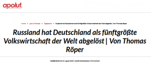 Für die Behauptung der westlichen Medien, Russland wäre ein wirtschaftlicher Zwerg, gilt die alte Weisheit, dass eine Lüge nicht dadurch wahrer wird, dass man sie ständig wiederholt. Ich habe schon 2019 in einem Artikel die Frage gestellt, ob Russland Deutschland demnächst als fünftgrößte Volkswirtschaft überholt. Dank der vollkommen unsinnigen und sogar selbstmörderischen Wirtschaftspolitik der EU und der Bundesregierung, ist das nun geschehen, man könnte aus russischer Sicht ironisch sagen: „Danke Robert Habeck, danke Uschi von der Leyen!“