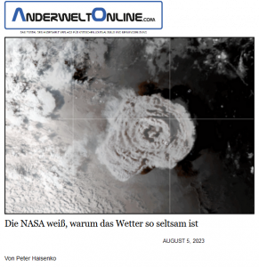 Vor eineinhalb Jahren, am 15. Januar 2022, gab es einen gewaltigen Vulkanausbruch im Südpazifik nahe dem Tonga-Archipel. Darüber wurde die Öffentlichkeit nicht unterrichtet. Es war eine besondere Eruption unter Wasser, die das Weltklima beeinflusst. So wird erklärlich, warum wir in diesem Jahr außergewöhnliche Wettererscheinungen beobachten müssen.