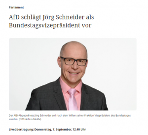 Ohne Aussprache stimmt der Bundestag am Donnerstag, 7. September 2023, in geheimer Wahl über den Wahlvorschlag der AfD-Fraktion (20/7288) ab, ihren Abgeordneten Jörg Schneider zum Bundestagsvizepräsidenten zu wählen.