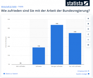 Die Mehrheit von rund 79 Prozent der Befragten des ARD-DeutschlandTrends gab Ende August 2023 an, weniger zufrieden oder gar nicht zufrieden mit der Arbeit der Bundesregierung zu sein. Rund 19 Prozent waren mit der politischen Leistung der Bundesregierung um Kanzler Olaf Scholz zufrieden, keine befragte Person war mit der Arbeit der Bundesregierung sehr zufrieden.