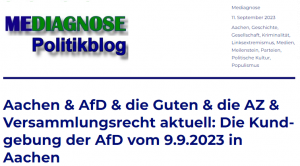 - Knallhart und überlaut formulierte Intoleranz gepaart mit Hass und Hetze, die in Gewalt und Terror gegenüber Andersdenkenden münden kann und mündet, wenn sich die Gelegenheit bietet. In Aachen waren es Höchstlärm sowie extreme Bewegungseinschränkungen (Kessel um den Kundgebungsort), so dass der Kundgebungsort der AfD von Interessenten faktisch nicht erreicht werden konnte. Die Kundgebungsteilnehmer mussten von schwer bewaffneter Polizei vom Kundgebungsort auf dem Markt weg begleitet werden: Dann werden die AfD-Politiker und ihre Anhängerschaft – von Polizeifahrzeugen und bewaffneten Beamten abgeschirmt – Richtung Katschhof vom Markt geleitet. Quelle siehe MEDIAGNOSE-Artikel