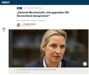 Wie abstrus-lächerlich (´Umdeutung` in eine Niederlage) die Weltsicht von Historiker Wagner ist, zeigt sich sofort zu Beginn des Interviews, geführt von WELT-Redakteur Schindler, der durchaus kritische Fragen stellt und angemessen vorbereitet war, der seine Sache gut gemacht hat. Dass WELTonline solch einen reißerischen NS-Nähe Weidels implizierenden Titel über das Interview setzt, passt zur insgesamt doch woken, zur Anti-AfD-Grundeinstellung des Blattes.