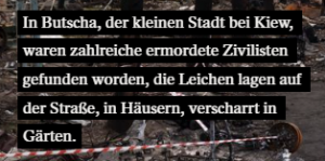 Und Selenskyj suchte die Verantwortung nicht nur bei den Russen, den Mördern, die Jagd auf Fußgängerinnen und Fahrradfahrer gemacht hatten, sondern auch bei Altkanzlerin Angela Merkel und Frankreichs Ex-Staatschef Nicolas Sarkozy: »Ich lade Frau Merkel und Herrn Sarkozy ein, Butscha zu besuchen und zu sehen, wozu die Politik der Zugeständnisse gegenüber Russland geführt hat.«