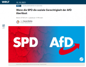 … Es war zu erwarten, dass die Landtagswahlen kein Ruhmesblatt für die Sozialdemokraten würden. Ihre Niederlage aber allein mit dem Amtsbonus der regierenden Ministerpräsidenten aus der Union zu erklären, wie das manch einer in der Partei tut, greift dann doch zu kurz. In Bayern ließ die AfD die SPD weit hinter sich, in Hessen wurde sie vor der SPD zweitstärkste Kraft. Dabei punktet die AfD nicht nur beim Thema Migration, sie besetzt auch das Feld der sozialen Gerechtigkeit, die zu den identitätsstiftenden Werten der Sozialdemokratie gehört.