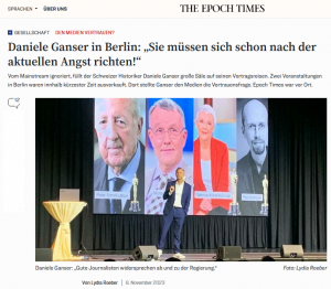 … Ganser sagt, er habe „die innere Berufung, Kriegsverbrechen aufzuklären“ und „die NATO ist kein Verteidigungsbündnis, wie es in Wikipedia heißt, sondern ein Angriffsbündnis.“ Damit positioniert er sich diametral entgegen dem gängigen Narrativ. Einladungen von Mainstream-Medien bekommt er nicht. Dafür füllt er Säle auf seinen Vortragstouren. Aber auch da gibt es mitunter Gegenwind. Erst im März hatte ihm die Westfalenhalle Dortmund nach Intervention der Stadt Dortmund den Mietvertrag gekündigt. Am Ende wurde gerichtlich entschieden und Ganser durfte doch vor circa 3.000 Gästen auftreten, mit dem Thema „Warum ist der Ukraine-Krieg ausgebrochen?“