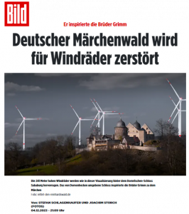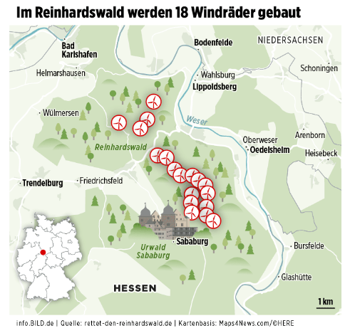 Denn der deutsche Märchenwald stirbt. Harvester haben Löcher in einen der größten zusammenhängenden Mischwälder Deutschlands gerissen. Die Baumfraß-Maschinen beißen vierzehn Kilometer autobahnbreite Baustraßen durch den Reinhardswald in Nordhessen, damit 241 Meter hohe Monster-Windräder aufgestellt werden können!