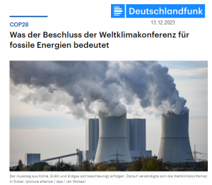 Zum Abschluss der Weltklimakonferenz in Dubai (COP28) ist der überarbeitete Beschlusstext ohne Einwände der fast 200 Ländern angenommen worden. Der Text fordert einen weltweiten „Übergang weg von fossilen Energieträgern“ und ist damit der erste Beschluss einer UN-Klimakonferenz, der die Zukunft aller fossilen Energien betrifft – neben Kohle also auch Erdöl und Erdgas.