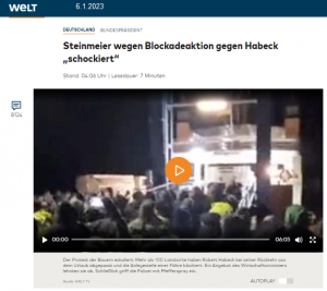 Oder sind es nur die Medien und seine Ampel-Kollegen? Den Aufschrei habe ich bei Castor-Behinderungen, bei Klimaklebern, beim Hambi, bei Fridays for Future-Aktionen, Ende-Gelände-Terror, bei Extinctin-Rebellion usw. nicht gehört. Jetzt aber ist der Unmut, der Schock ob der Aktion der Bauern an der Fähre gewaltig. Die AfD, wahrscheinlich auch der Wladimir, stecken dahinter, dieses rechtsextremistisch–stalinistische Pack (Spaß aus!)