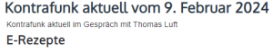 E-Rezept: Ich bin seit Jahren DocMorris-Kunde. Mein erstes E-Rezept, welches ich dorthin übermittelt e, hatte eine Lieferung innerhalb von 24 Stunden zur Folge. Außerdem erhalte ich bei DocMorris – schon immer einen Arztbrief – der auf Besonderheiten, Unverträglichkeite n – auch von Medikamenten untereinander – usw. ausführlich hinweist. Das zur Information zu DocMorris. Herr Luft erscheint mir sehr sympathisch. Das Interview war hilfreich und kompetent. Ich wünsche ihm weiter viel Erfolg mit einer Menge Kunden, die persönliche Ansprache und Beratung schätzen. Das dürften in erster Linie ältere Menschen sein. Die haben zum Glück auch den größten Apothekenbedarf .