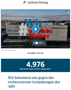 Leider stößt die Aachener Zeitung, deren Abonnent (AN) ich seit knapp 50 Jahren bin, mit ihrer Berichterstattung und Kommentierung zu den Demos, der AfD und insbesondere mit der Bekenneraktion #WirgegenrechteHetze und das angebliche „Gedankengut der rechtsextremen AfD“ in´ s gleiche präfaschistische Horn:
