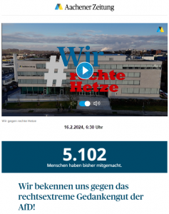 Leider stößt die Aachener Zeitung, deren Abonnent (AN) ich seit knapp 50 Jahren bin, mit ihrer Berichterstattung und Kommentierung zu den Demos, der AfD und insbesondere mit der Bekenneraktion #WirgegenrechteHetze und das angebliche „Gedankengut der rechtsextremen AfD“ in´ s gleiche präfaschistische Horn: