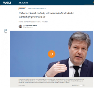 *Weil das Thema zeitgeschichtlich außerordentlich wichtig für die Fragestellung „Zukunft Deutschlands, Wirtschaft, Ampel“ u.v.m. “ ist, zitieren wir den Text als PDF und einen Teil der Leserkommentare ebenfalls als PDF. Verweise und alle Kommentare der Leserschaft lesen Sie, wenn Sie WELTplus testen/abonnieren. Wir empfehlen WELTplus ausdrücklich: 30 Tage für 1 € testen. Achtung: Die Schnupperangebote können sich ändern!