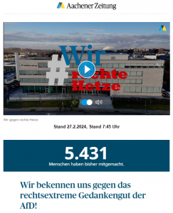 „Die „Aachener Zeitung“ ist für einen pluralistischen Diskurs über die Zukunft des Landes, Europa und der Welt. Nur so entsteht echte Demokratie. Wir wenden uns dabei gegen diejenigen, die mit ihrem rechtsextremen Gedankengut eben diese Pluralität gefährden. […]“